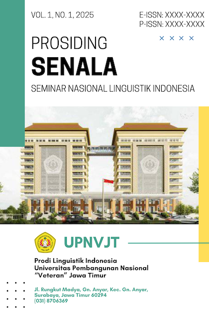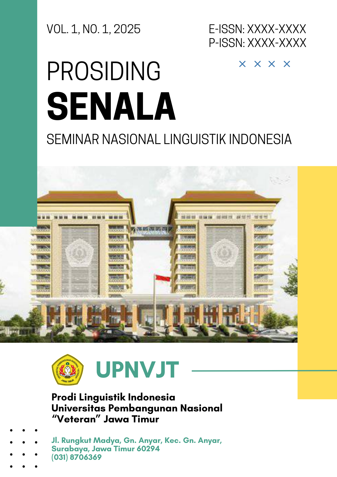 Prosiding SENALA (Seminar Nasional Linguistik Indonesia) is a scholarly publication that compiles selected articles presented at the Annual National Seminar of Indonesian Linguistics. It is published periodically to document and disseminate new ideas, research findings, and critical perspectives in the fields of linguistics and language studies. This proceeding welcomes diverse topics, ranging from theoretical and applied linguistics, sociolinguistics, psycholinguistics, discourse analysis, language education, translation studies, to innovations in language technology. Each manuscript submitted to this proceeding undergoes a peer-review process to ensure academic integrity, originality, and significant contributions to the development of linguistics, particularly in the Indonesian context.