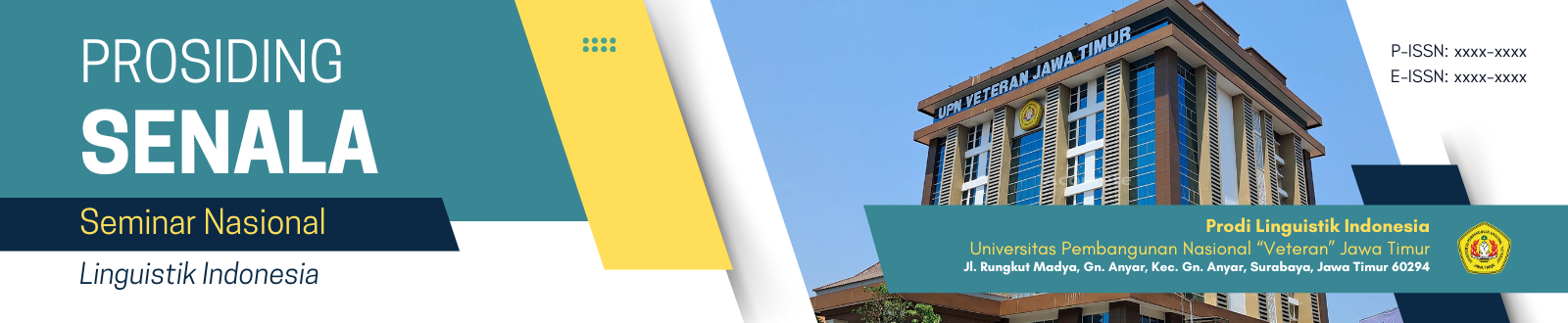This proceeding is published annually by Indonesian Linguistics Department, Faculty of Social, Cultural, and Political Sciences, UPN "Veteran" Jawa Timur, Jl. Raya Rungkut Madya, Gunung Anyar, Surabaya, East Java, Indonesia 60294. Contact: +6282318007953. Email: senalaupn@gmail.com